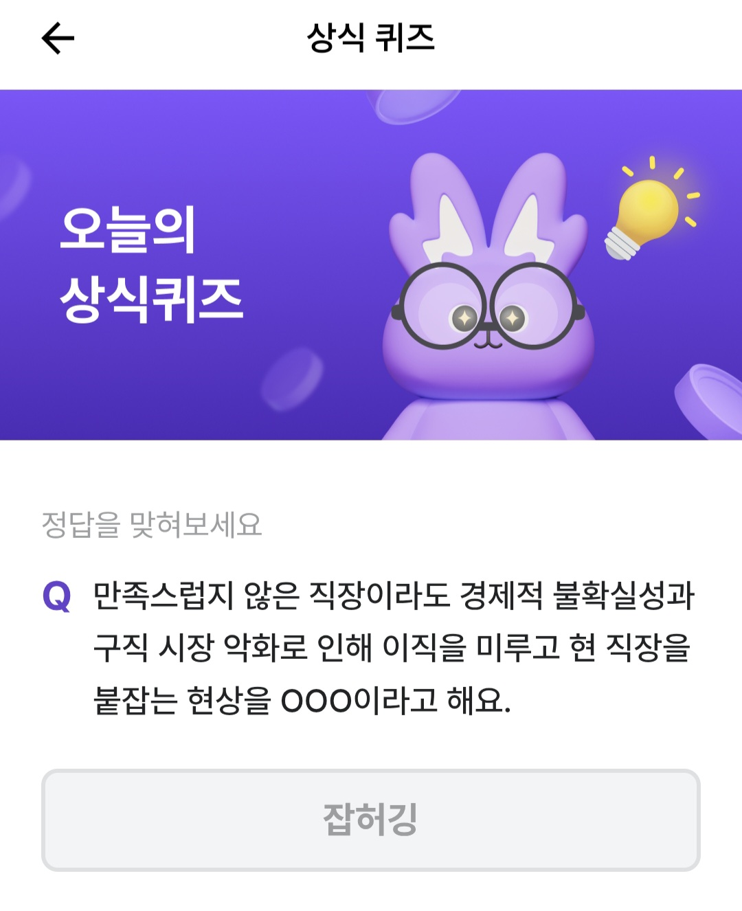 비트머니 오늘의 퀴즈, "만족스럽지 않은 직장이라도 경제적 불확실성과 구직 시장 악화로 인해 이직을 미루고 현 직장을 붙잡는 현상을 ㅇㅇㅇ이라고 해요"