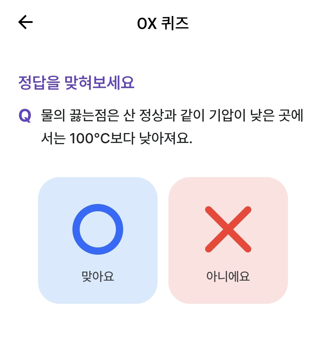 "물의 끓는점은 산 정상과 같이 기압이 낮은 곳에서는 100 도씨보다 낮아져요."